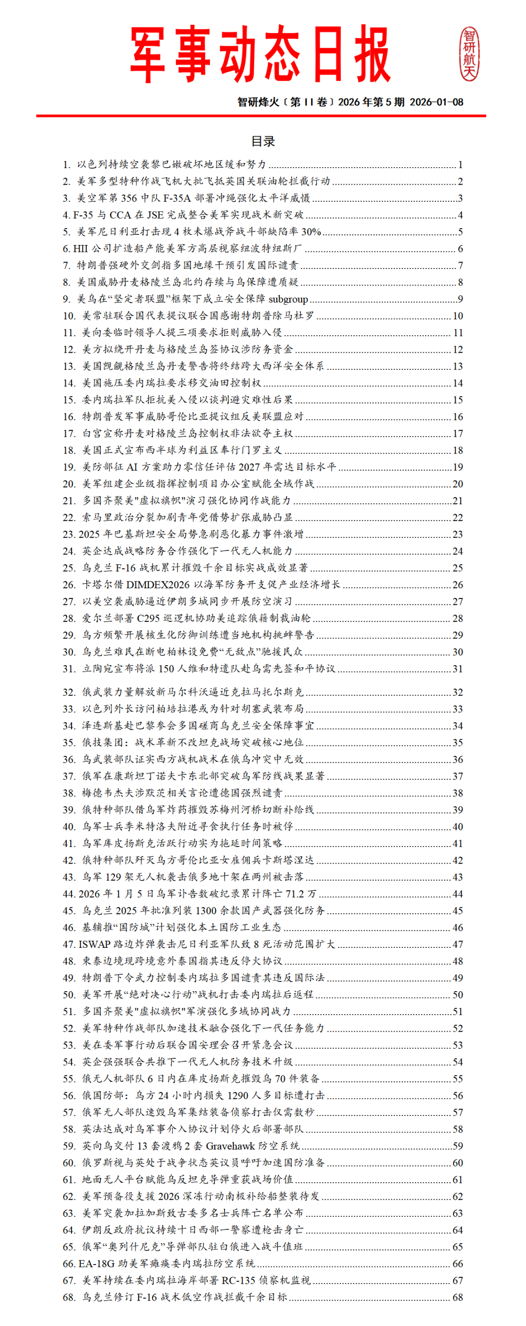 《全球防务动态》系列专刊国内独家每日发布涵盖航天领域、武器装备、军事热点、人工智能、先进制造等领域的全球动态信息。提供航天动态专报装备动态专报军事动态专报智造动态专报以及航天防务新闻日报等特色产品模块工作日每日推送,形成结构化、可编辑的文档,供订阅用户在小程序智研烽火信息商城下载。每日及时的动态信息能够有支持各单位进行报送、军情研究与安全形势分析的需求。