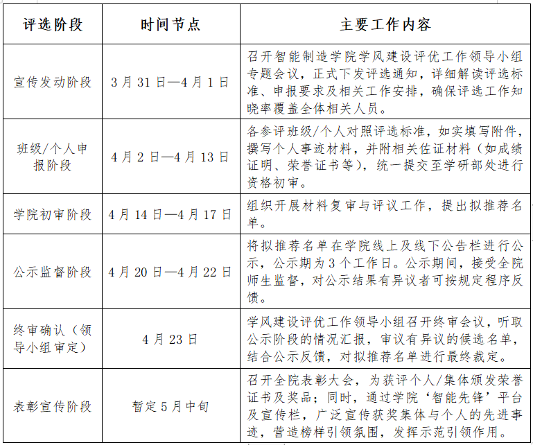 成立智能制造学院学风建设评优工作领导小组,负责本次评选的组织、审核和监督工作。
