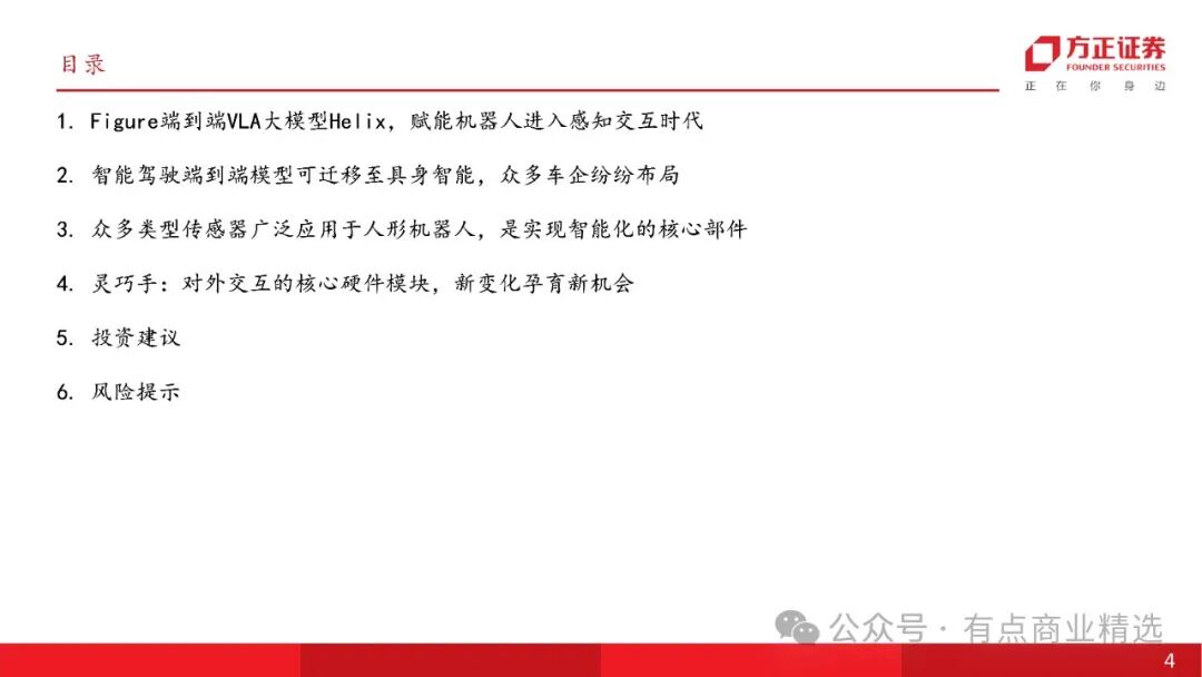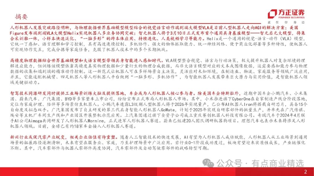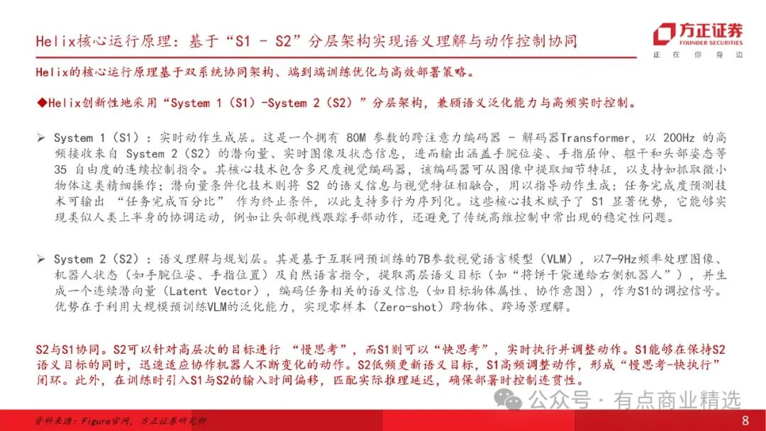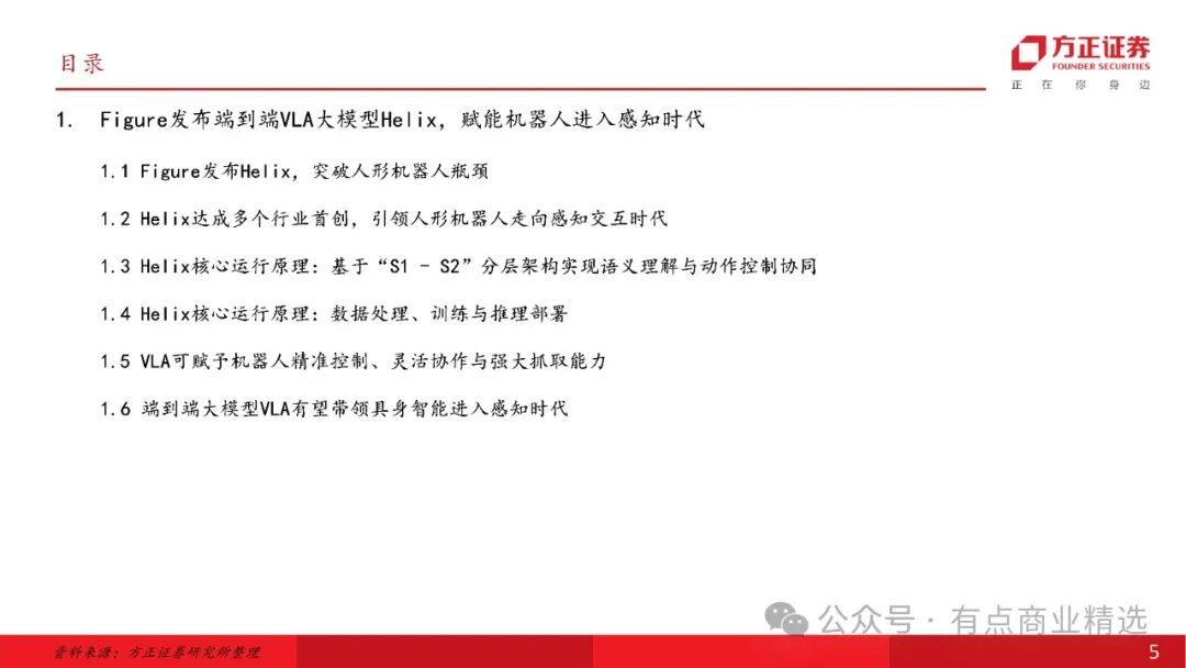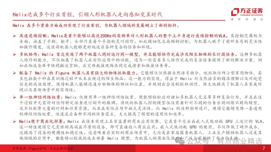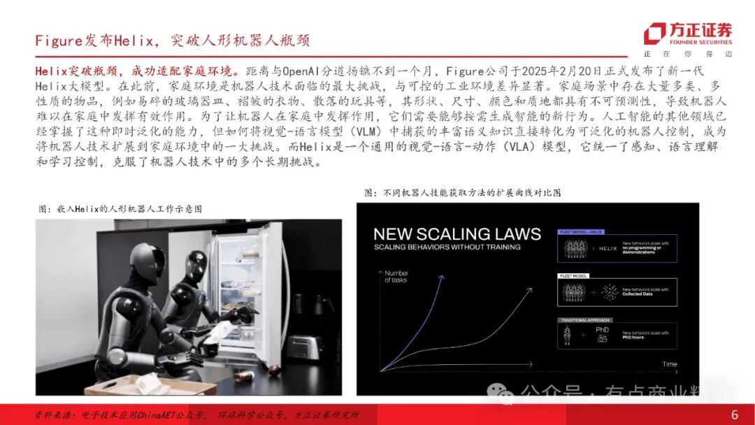 人形机器人发展突破路径明晰,与物理数据世界基础模型模型结合的视觉语言动作端到端大模型VLA是目前人型机器人走向AGI的解决方案;美国Figure发布端到端VLA大模型Helix实现机器人多业务协同突破;智元机器人将于3月10日正式发布首个通用具身基座模型——智元启元大模型,将集合采训推一体,小样本快速泛化、“一脑多形”的跨本体应用、持续进化、人类视频学习等能力。Helix是一个通用的视觉-语言-动作(VLA)模型,它统一了感知、语言理解和学习控制,具有高速连续控制、多机协作、强大的物体抓取能力、统一神经网络、便于商业化部署等多种特性,使机器人可实现协作交互,完成分拣等家庭任务,克服了机器人技术中的多个长期挑战。