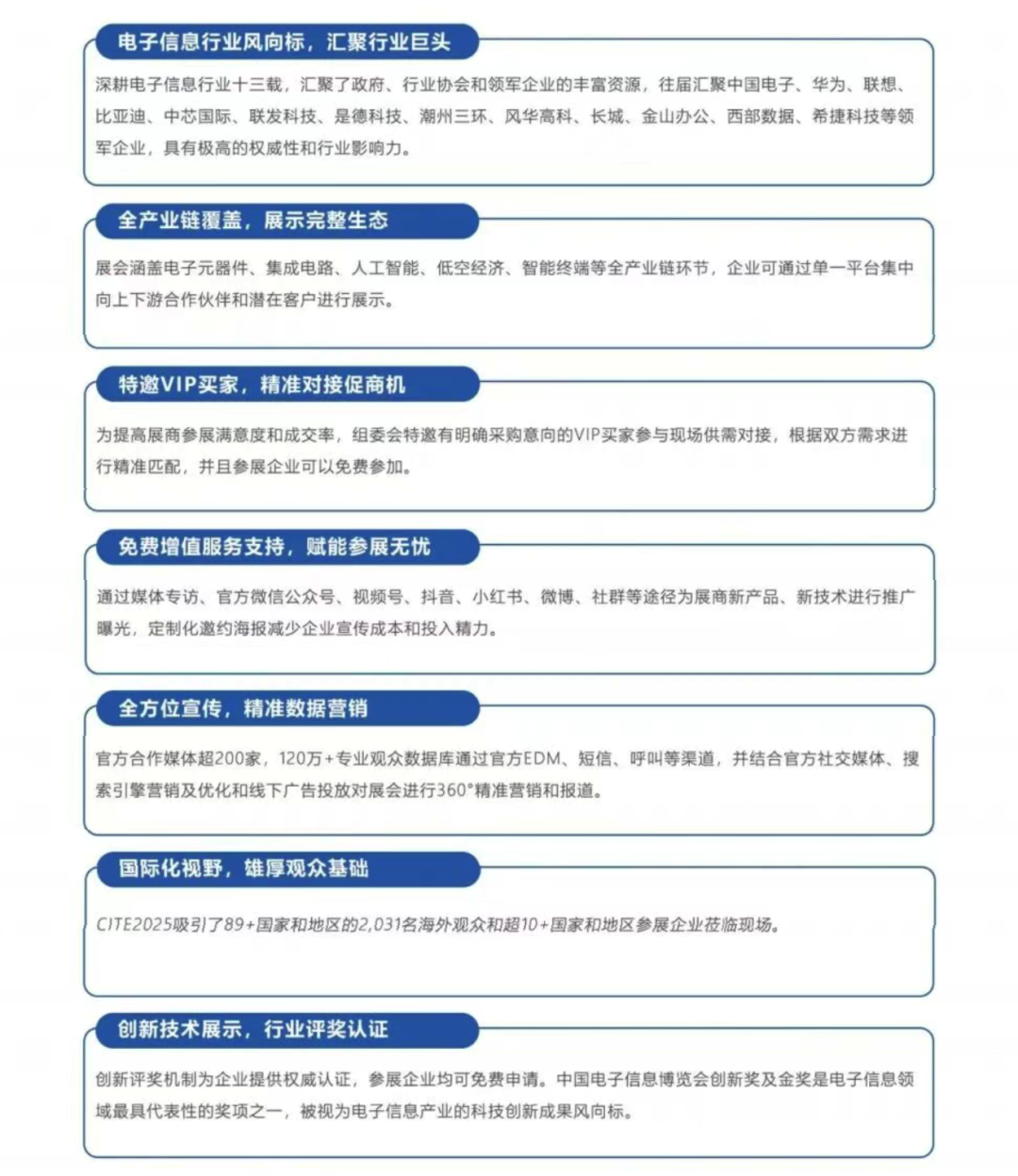 中国电子信息博览会(中文简称:电博会,英文简称:CITE)是由工业和信息化部与深圳市人民政府联手打造的国家级电子信息全产业链展示平台,经过十三年沉淀与发展,现已成为亚洲极具规模和影响力的电子信息博览会。