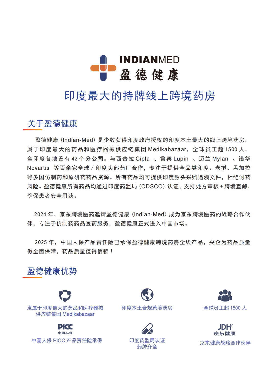 盈德健康(lndian-Med)是少数获得印度政府授权的印度本土正规跨境药房。盈德健康属于印度最大的药品和医疗器械供应链集团Medikabazaar,全球员工超1500人,全印度各地设有42个分公司。盈德健康为病友们提供印度、老挝、孟加拉等多国仿制药和原研药的合法跨境购买服务,所有药品均可提供印度源头采购追溯文件,杜绝假药风险。盈德健康所有药品均通过印度药监局(CDSCO)认证,支持处方审核+跨境直邮,确保患者安全用药。