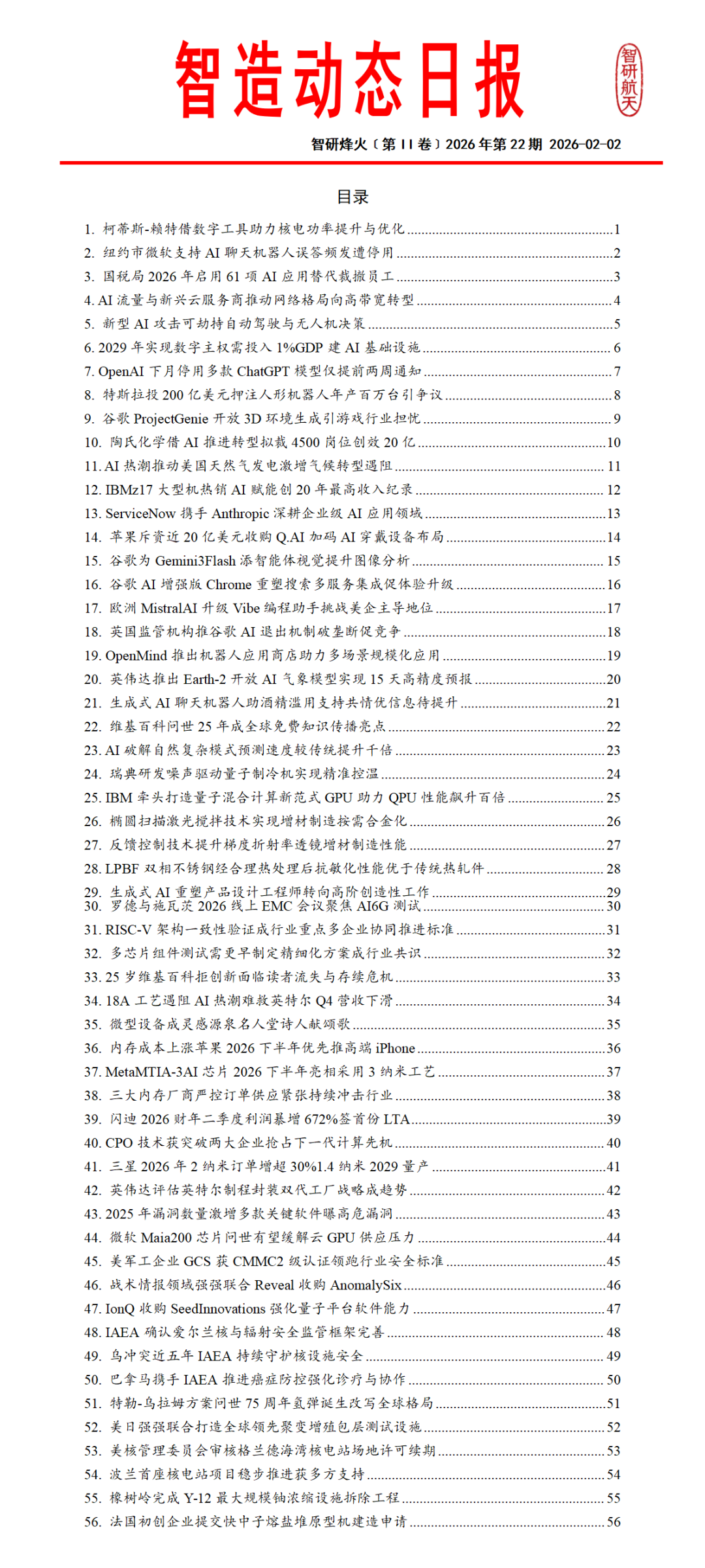 聚焦全球智能制造领域的权威情报产品,每日精选航空技术与应用、人工智能、工业机器人、增材制造、芯片工艺等核心技术突破与产业动态,以结构化、可编辑的文档形式呈现。内容涵盖技术解析、企业战略及政策影响,依托资深专家团队及强大的开源情报处理能力,助力企业快速捕捉技术趋势与市场机遇,把握智造脉搏,引领产业升级。