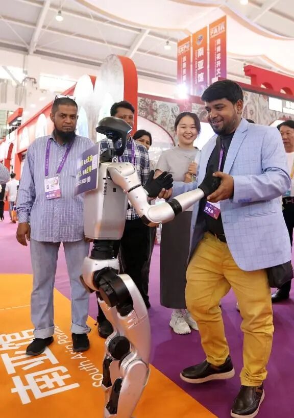 第9届南博会上,外国参展商与机器人互动。陈飞 摄