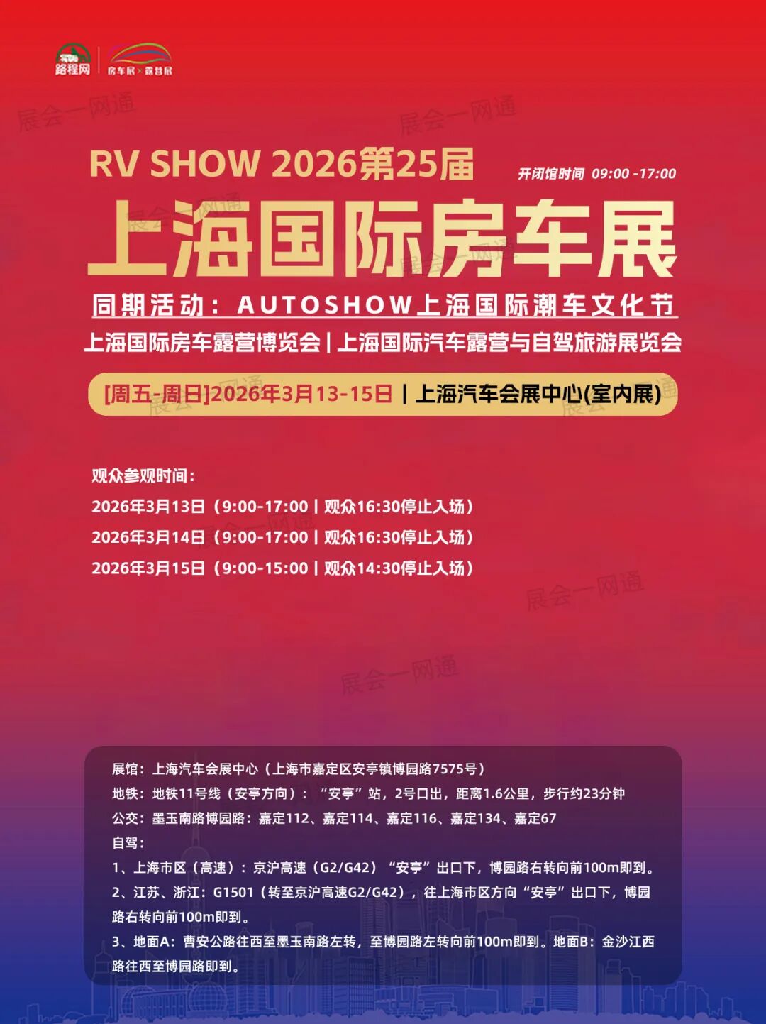 2026第25届上海国际房车展(简称:上海房车展)将于3月13-15日(周五-周日)在上海汽车会展中心举办!本届展会采用“线上提前实名制预约登记、线下免费入场”的形式参观入场,完成预登记即可免费获取电子入场凭证。本届展会以“在上海·链全球”为核心主题,坚持“房车+”战略,深度融合品牌房车、汽车改装、户外露营、配套配件、车文化五大板块,同步举办AUTOSHOW上海国际潮车文化节子展,打造一场集展览、赛事、论坛、交易于一体的全产业链国际盛会。