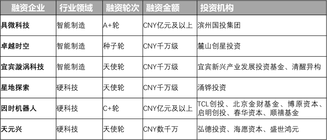 项目简介:具微科技是一家四足机器人研发商,其轮式四足机器人最新迭代产品为MOVENEW P1,该产品在负重、续航、功能模块等核心指标上处于行业领先水平,具备400kg负载能力、12小时超长续航及模块化上装等特性,区别于消费级和普通行业级机器狗产品。项目简介:卓越时空是一家智能铁路装备研发商,主要从事智能轨排精调系统研发业务,产品主要应用于成达万高铁施工路段。项目简介:宜宾漩涡科技是一家AI消费电子产品研发商,主要从事AI语音交互终端进入工程样机研发、智能硬件原型开发等业务。项目简介:星地探索是一家卫星安全产品与安全运营服务提供商,公司专注于卫星安全与太空安全,致力于为航天行业提供安全产品与解决方案。投资方:TCL创投、北京金财基金、博原资本、启明创投、春华资本、顺禧基金项目简介:因时机器人是一家机器人核心零部件研发制造商,专业从事伺服电动推杆和末端执行器研发、生产及销售服务,产品主要应用于机器人、生物医疗、工业自动化和教育科研等领域。项目简介:天元兴是一家通用工业具身智能平台研发商,主要从事轮式底盘人形双臂机器人“TX01”研发业务,该平台面向工业场景提供柔性搬运、上下料、精密装配及主动质检等核心作业能力,精准匹配工业产线柔性的多样化、灵巧作业需求。在此,厚福资本再次恭喜以上获得融资的企业,未来业绩长虹,行稳致远,不断通过科技创新助力中国实体经济的高质量发展。