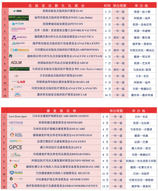 实验室技术和诊断测试、医疗用品和耗材、康复产品、医疗配件产品、医疗设备和医学成像、医疗技术解决方案、物理治疗和矫形技术、IT系统和IT解决方案、制药及配件产品等。