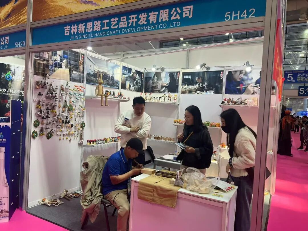 新思路、艺林等工艺品企业现场展示手工技艺,匠心制作吸引众多客商驻足洽谈,现场销售火热、客流不断。