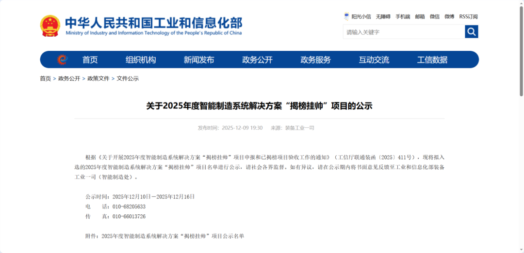 根据《关于开展2025年度智能制造系统解决方案“揭榜挂帅”项目申报和已揭榜项目验收工作的通知》(工信厅联通装函〔2025〕411号),现将拟入选的2025年度智能制造系统解决方案“揭榜挂帅”项目名单进行公示,请社会各界监督。如有异议,请在公示期内将书面意见反馈至工业和信息化部装备工业一司(智能制造处)。