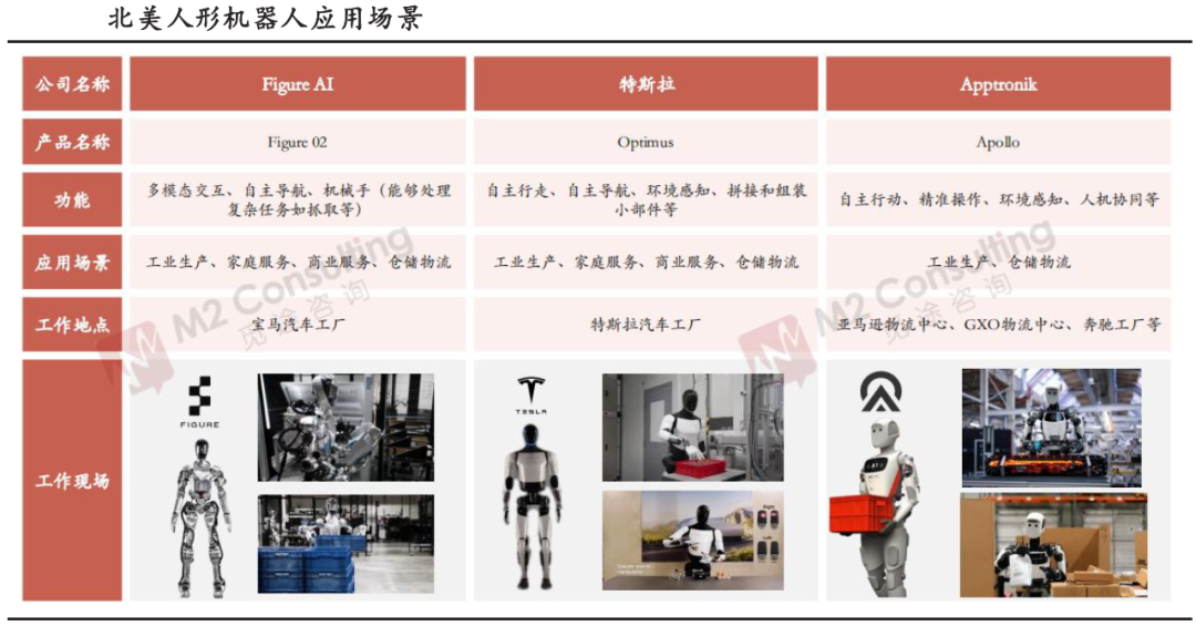 北美人形机器人已率先应用于汽车工业,物流等行业。以北美为例,Figure 02应用于宝马汽车工厂,特斯拉Optimus应用于自家特斯拉汽车工厂,Apollo在亚马逊、GXO等物流中心和奔驰工厂均有应用。且北美机器人巨头产品均有自主行走、自主导航等功能,且能处理抓取、拼接、组装小零部件等较为复杂的业务。我认为人形机器人与传统机械臂、工业机器人等功能具备较大差异,且在未来逐步发展后将会具备更大优势,值得期待。