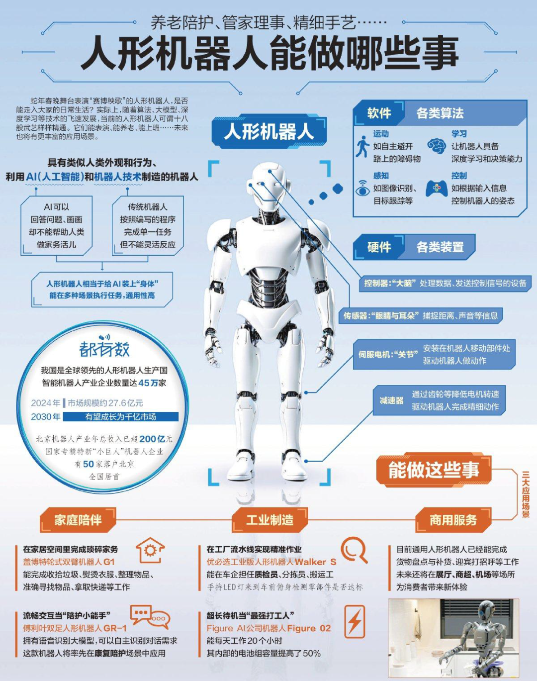 人形机器人作为人工智能与机器人技术深度融合的产物,其应用场景可拓展至社会生产生活的方方面面。在工业制造领域,人形机器人凭借高精度感知与灵巧操作能力,已深度融入汽车制造、3C电子、电力生产等场景,例如在汽车工厂中执行分拣配料、车身质检等高复杂度任务;在3C制造领域,通过视觉识别和力控技术实现物料精密装配,甚至能完成柔性薄膜物体的精细操作。