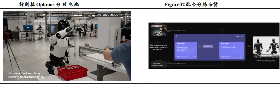 工业场景的应用已经逐步到来,大模型为人形机器人带来不可替代性。自2024年4月起,Optimus已在特斯拉旗下电池工厂开始作业,主要负责4680型电池单体的分类与托盘插入工作。在演示中,它能与自动化设备配合,将电池精准抓取并整齐摆放在料箱中,展现出适配工业节拍的高效性。