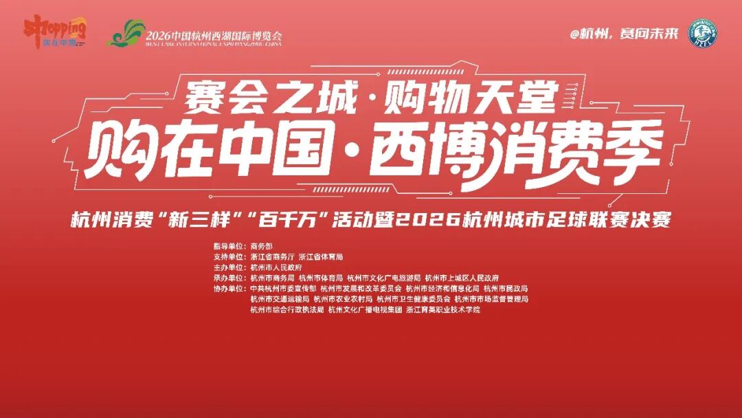 此外,活动现场还发布了2026“购在中国·西博消费季”十大主题活动,包括【共享在杭州】"共享大市场·出口中国"、【好物在杭州】全球好物杭州推介、【赛事在杭州】浙江省城市足球联赛(杭州赛区)、【潮玩在杭州】抖音电商溜达节杭州专场、【时尚在杭州】杭州湖滨国际美妆节、【首店在杭州】桐庐旅行业态首店发布、【美食在杭州】味美浙江·食在杭州、【焕新在杭州】杭州焕新消费季、【会展在杭州】第二十六届中国零售业博览会,涵盖外贸新机遇、国潮新风尚、赛事新体验、绿色新生活等多个维度,未来三个月,科技、时尚、文旅、体育等全领域消费活动将轮番上演,全方位激活杭州消费市场内生动力。
