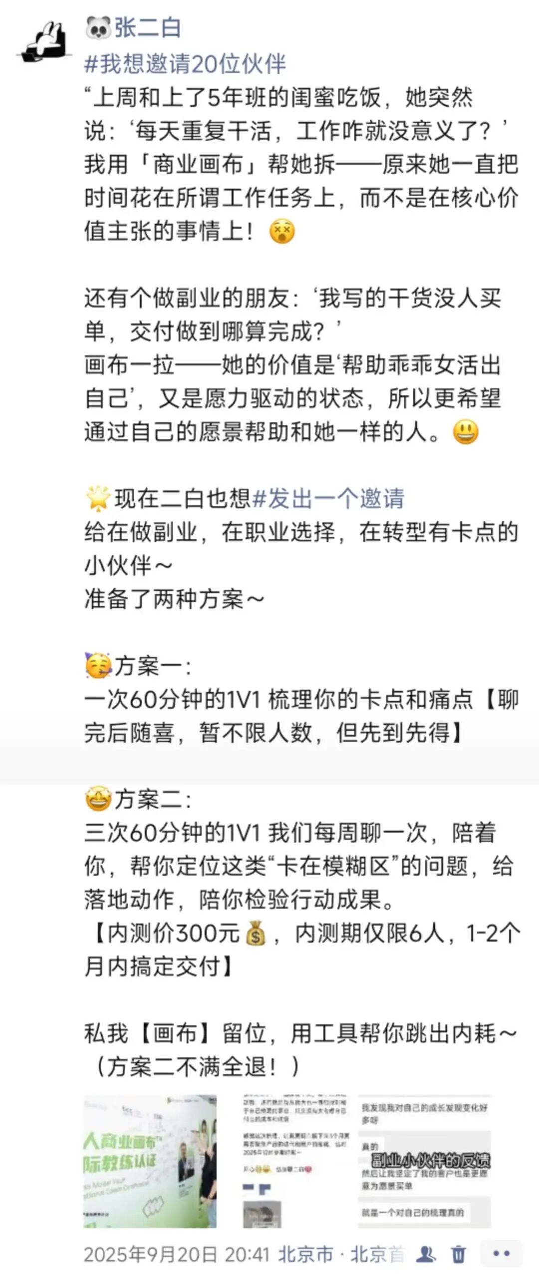 学习教练以后,也渴望能帮到更多人,参加了北辰的五四青年低谷青年帮助计划、离职体检计划,也自己发起过公益随喜的助力,帮助在做副业探索、职业转型、职场目标设定等有困惑的小伙伴做教练对话,陪伴大家发现问题,走出来。