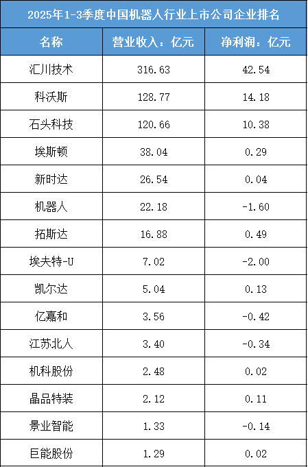 根据东财行业分类,2025年1-3季度中国机器人行业上市公司企业排名如下:(A股上市公司)