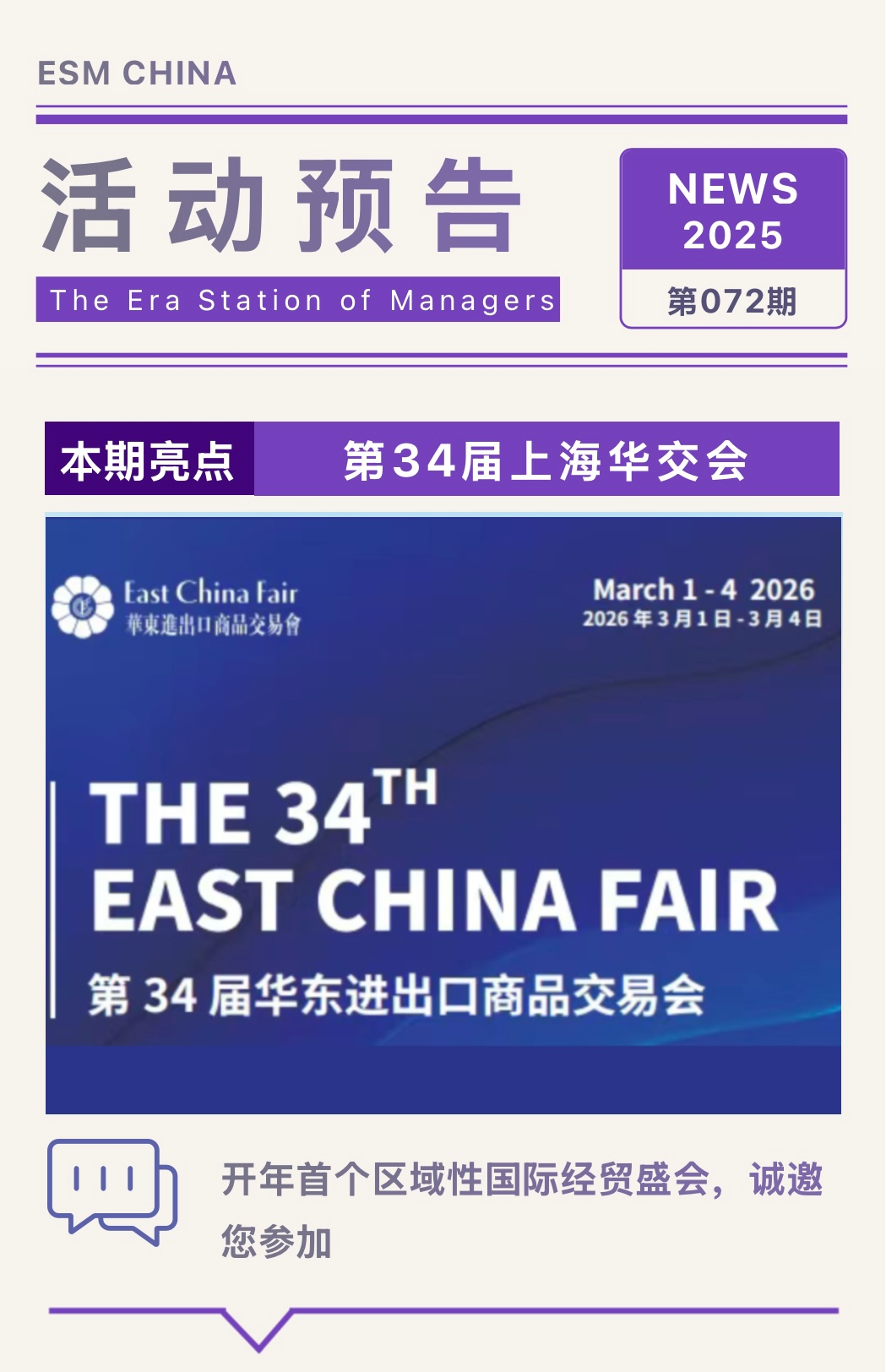 2026年第34届华东进出口商品交易会(简称#上海华交会)将于2026年3月1日至4日在上海新国际博览中心举办。作为开年首个区域性国际经贸盛会,华交会素有中国“外贸新春第一展”之称。本届展会将设4个专业子展和2个专业展区:服装服饰展、纺织面料展、家庭用品展、装饰礼品展、境外展区和跨境电商展区,总规模为11.5万平方米。