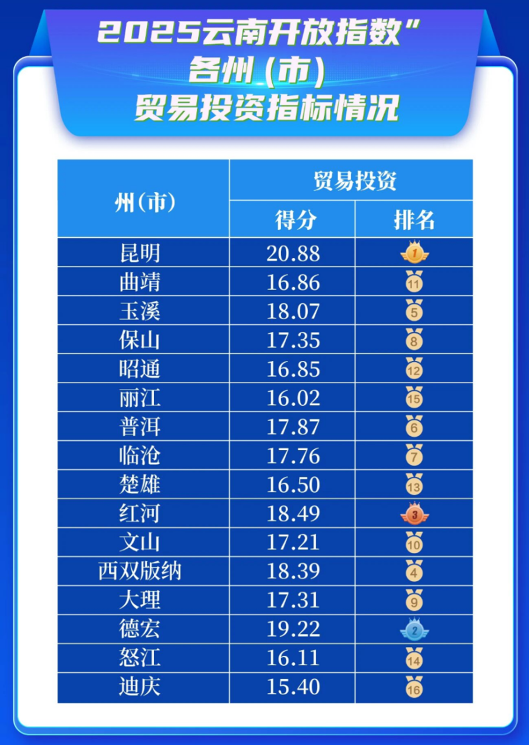 昆明(20.88分,第1):综合实力断层领先,外贸进出口总额占全省比重从2020年41.2%提升至2025年63.3%;抖音、华为、立讯精密、宁德时代等一批龙头企业落地,工业投资、产业投资占比实现“双翻番”,是全省投资贸易一体化发展的标杆。