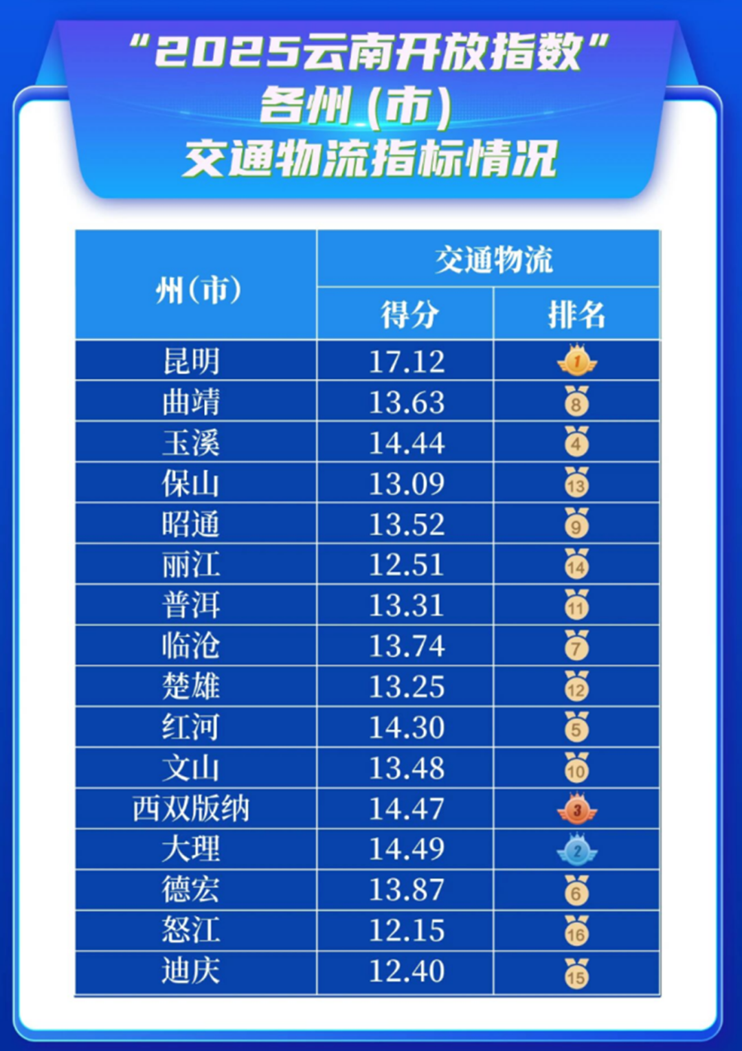 导读 日前,学会发布“2025云南开放指数”(点击回顾开放观察|“2025云南开放指数”出炉!一图解锁),从交通物流、市场活力、贸易投资、人文交往、发展支撑五大核心维度,全面勾勒出全省16个州市开放版图,清晰呈现出云南“核心引领、前沿突破、全域联动”的开放格局。本文将以五大指标维度入手,深度解锁各地开放密码。