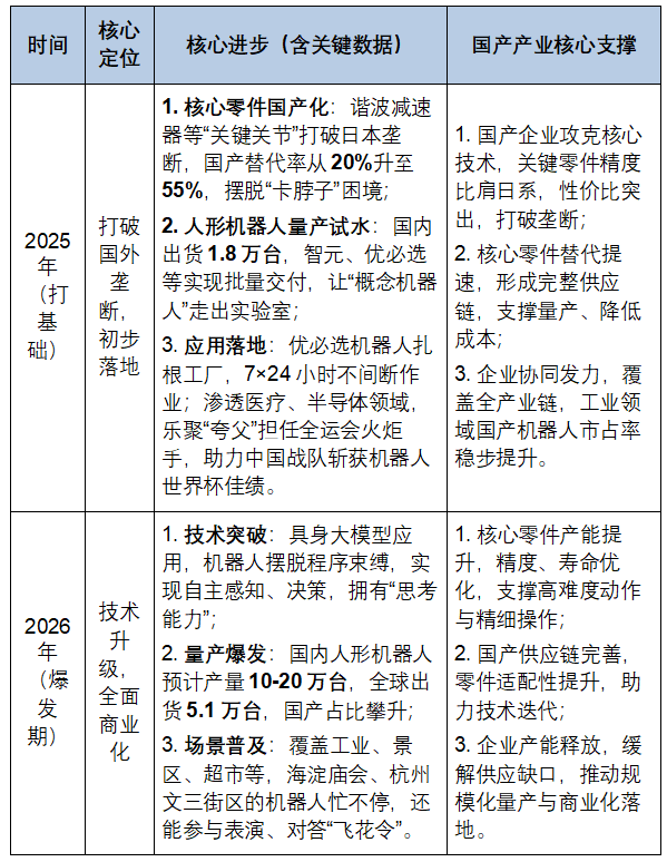 3. 国产底气:上百家企业形成完整产业链,专利申请量占全球三分之二,加之政策、资本支持,实现“从无到有、从弱到强”。2026年春晚人形机器人核心零部件国产化率超70%,彰显中国智造实力。