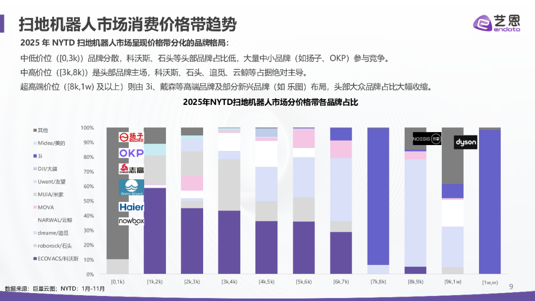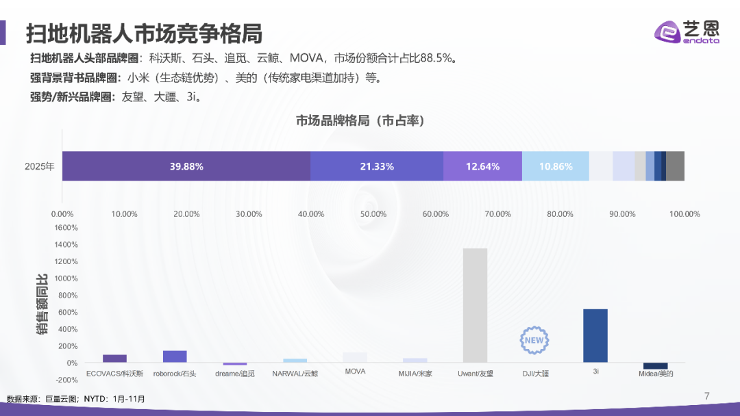2025年1-11月扫地机器人市场销售额超52亿,同比增长近51%;受国补推动,2025年大促同比爆发力显著高于2024年大促。从全年趋势看,核心增长爆发月为大促月,5月增长4.04亿、6月增长3.56亿;扫地机器人具有显著的大促爆发特征,主力销售期集中在大促月,侧面印证消费者的购买决策周期相对较长。
