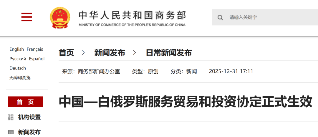 《中华人民共和国政府和白俄罗斯共和国政府服务贸易和投资协定》(以下简称《协定》)于2024年8月22日签署,双方已分别完成国内批约程序。《协定》将于2026年1月1日正式生效。