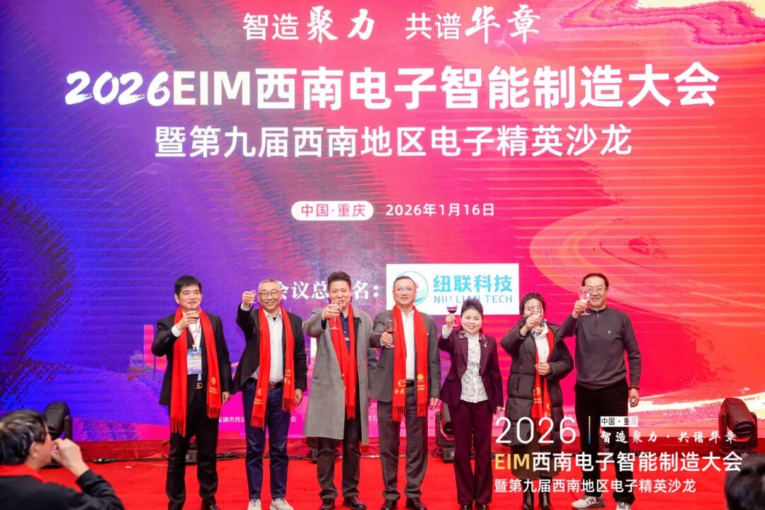 2026 年1月16日,由浙江纽联科技有限公司总冠名;深圳市终端电子制造产业协会、广东省电子学会SMT专委会主办;华友(重庆)企业管理咨询有限公司、西南电子智能制造服务中心承办的“2026 EIM 西南电子智能制造大会暨第九届西南地区电子精英沙龙”在重庆两江新区瑞尔大酒店成功举办。