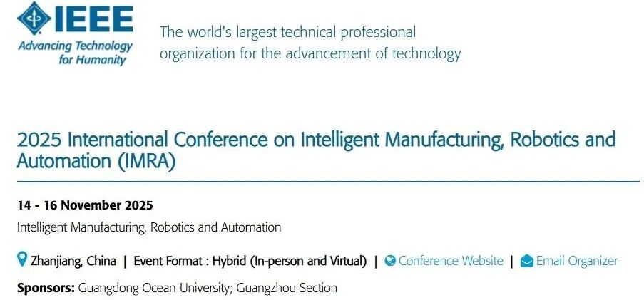 2025年智能制造、机器人与自动化国际学术会议(IMRA2025)于2025年11月14日至16日在中国湛江举办,本次大会由广东海洋大学主办,由广东海洋大学机械工程学院和省市共建南海海洋牧场智能装备广东省重点实验室承办,哈尔滨理工大学、世纪中文出版社、长春工业大学、东华大学、澳门科技文化交流协会协办,并由IEEE广州分会、RDLink研发家提供技术支持。