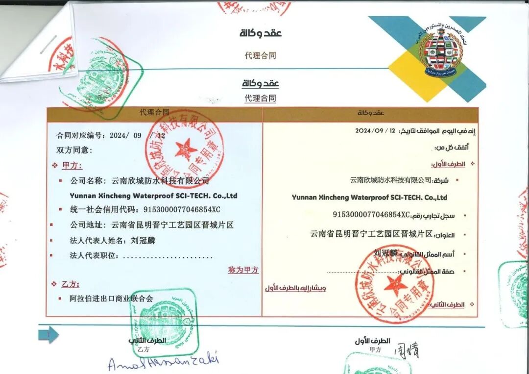 2024年5月,欣城防水先后参加上海国际防水高端论坛、第135届广交会、第24届南亚博览会、第18届越南(胡志明)国际建材博览会、中阿可持续发展经贸论坛-国际政府采购精准对接会,并与阿拉伯进出口商业联合会正式达成合作。