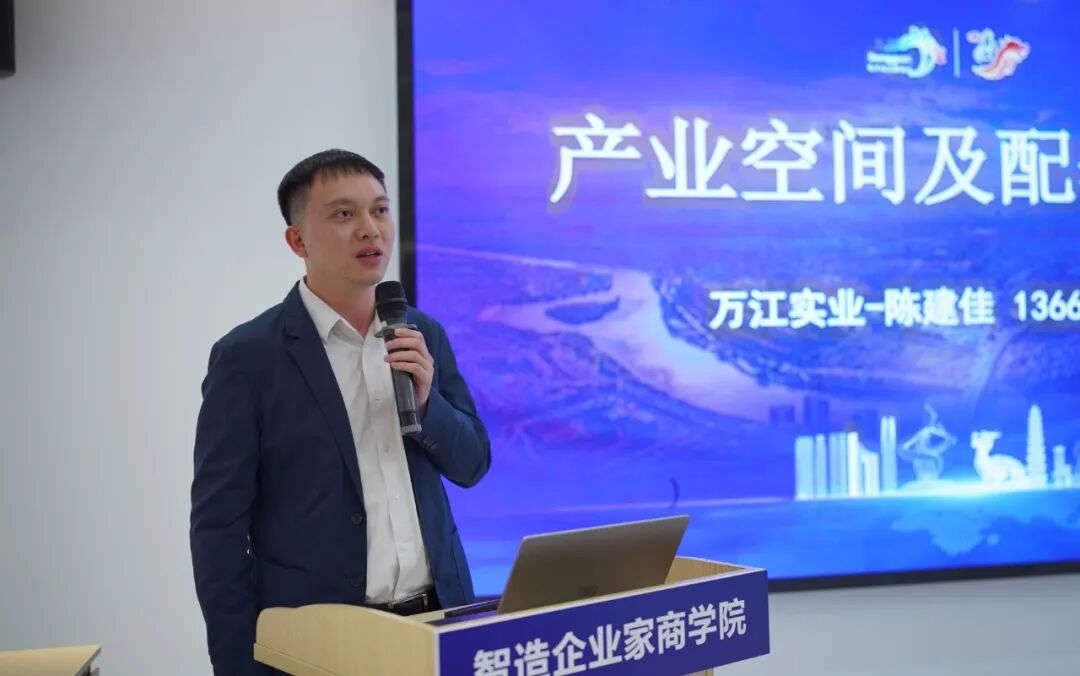 万江实业投资控股有限公司董事长、党支部书记陈建佳,为会员介绍万江街道打造的低成本、高品质的产业园,将聚焦新能源和半导体集成电路两大赛道,非常贴合智能装备企业入驻,可租赁或购买,原房东自建招租管理,红本产权清晰,让会员安家无忧。