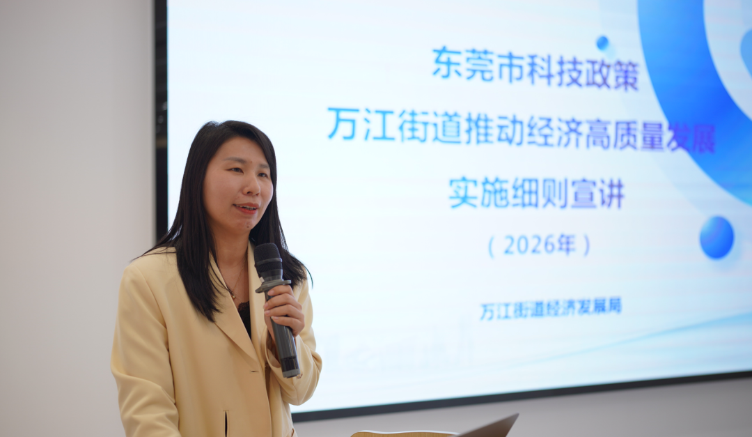 万江街道经济发展局党支部委员陈燕玲发言,现场解读东莞市“8+8+4”产业体系,该体系衍生下有技术攻关项目补助、人才创新创业项目补助、高新技术企业贷款贴息、人才子女入学保障、企业购买设备补助等等。解决了技术、人才、资金的核心问题,万江专属的政策又做了精准补充,让补贴更实在、申报更便捷、福利更贴合本土需求。