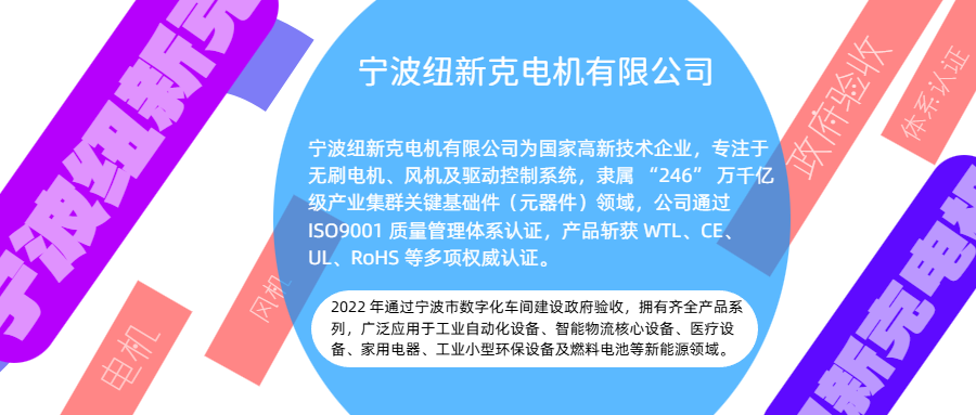 宁波纽新克电机有限公司(以下简称“公司”)成立于2011年3月9日,注册资金2000万元,是一家专业从事无刷电机、风机的研发、生产和销售的国家高新技术企业,公司面积超过3000平方米。