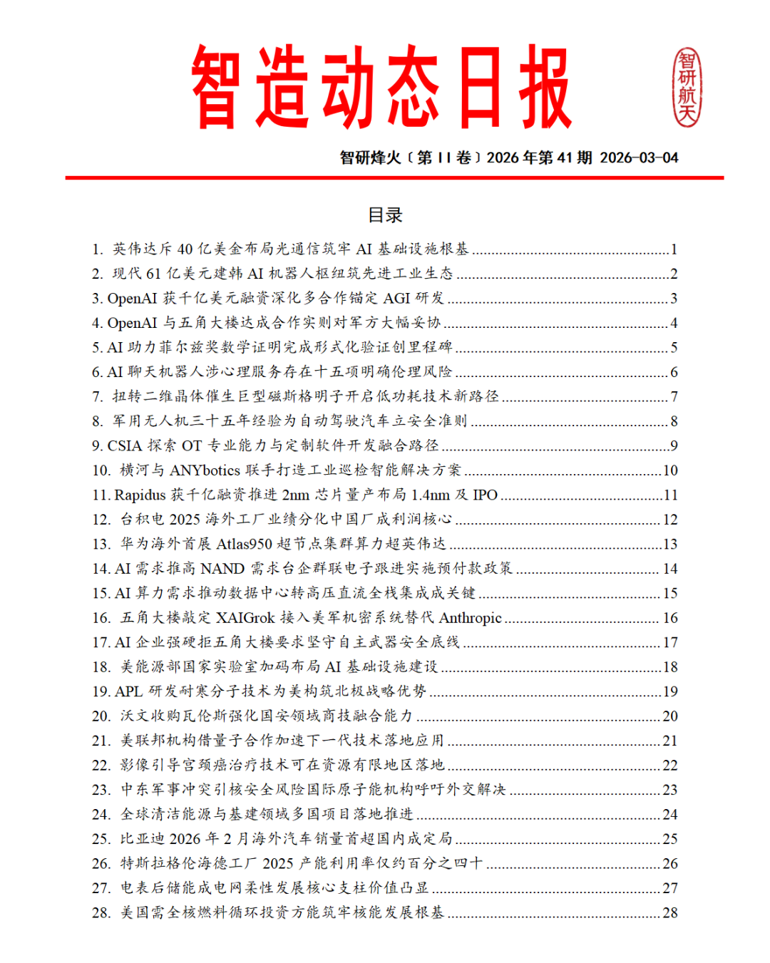 聚焦全球智能制造领域的权威情报产品,每日精选航空技术与应用人工智能、工业机器人、增材制造、芯片工艺等核心技术突破与产业动态,以结构化、可编辑的文档形式呈现。内容涵盖技术解析、企业战略及政策影响,依托资深专家团队及强大的开源情报处理能力,助力企业快速捕捉技术趋势与市场机遇,把握智造脉搏,引领产业升级。