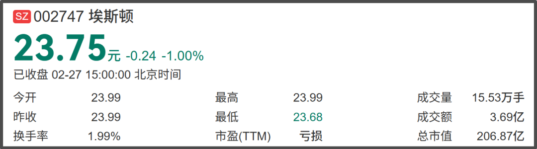 此前,埃斯顿已在A股上市11年(002747.SZ),市值超200亿元,A股上市以来直接融资约20亿元。过去一年,埃斯顿股价同比下降约4.08%。截至227日收盘,埃斯顿股价为23.75/股。