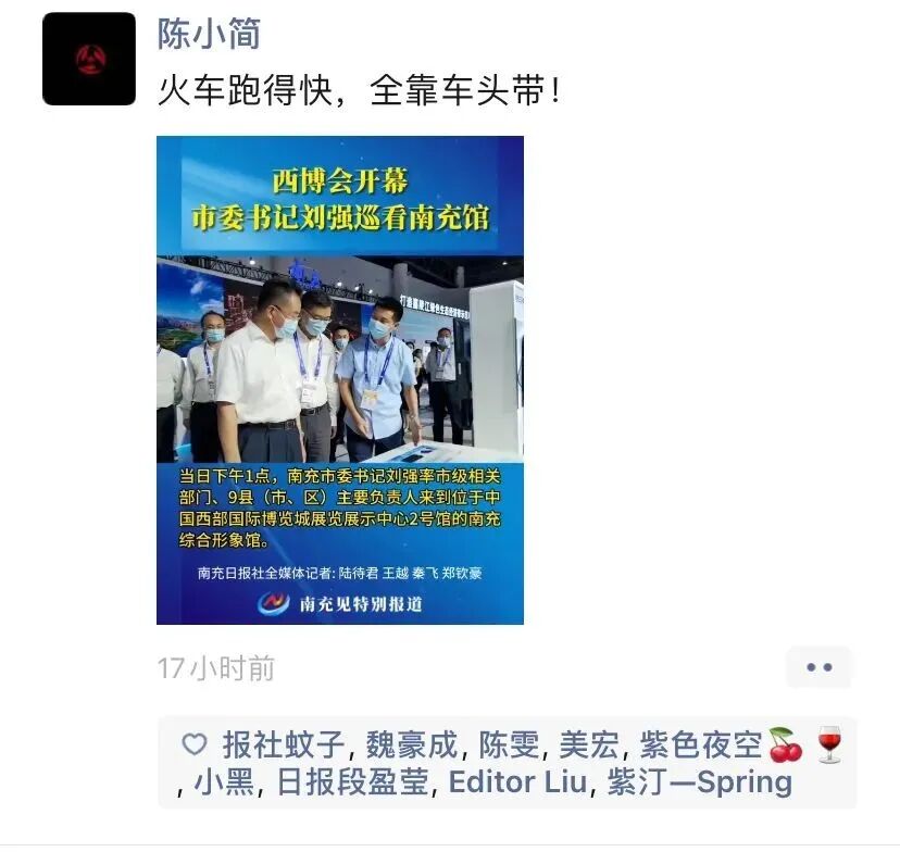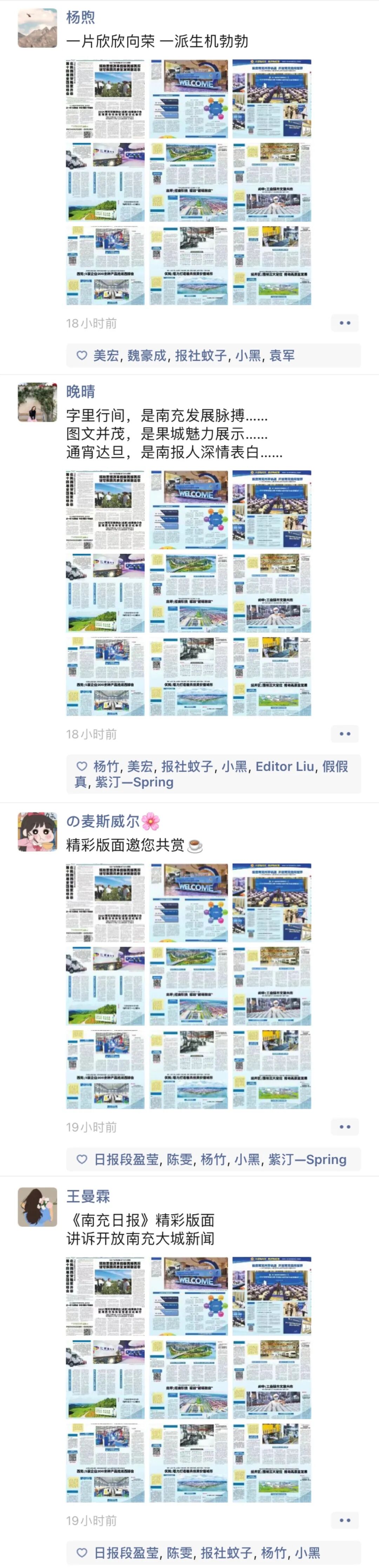 为了让更多读者欣赏到相关新闻产品,南充日报社“百人传播群”先后多次通过微信朋友圈大规模扩散,吸引众多网友围观、留言、点赞。大量网友在朋友圈进行二次扩散,传播效果显著增强。“期待着南充越来越好!”“南充争创全省经济副中心,加油!”一些网友在留言时说。