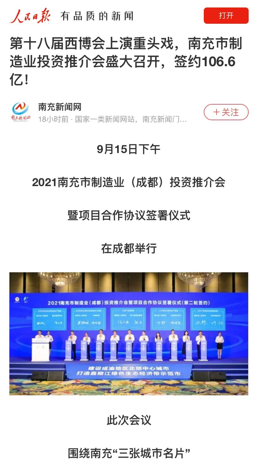 16日,新华社客户端以《第十八届西博会南充市制造业投资推介会签约106.6亿》为题转载该篇报道,引发全国网友关注,阅读量一路“飙升”。截至当晚9时,阅读量超110万次。同时,人民日报客户端也以《第十八届西博会上演重头戏,南充市制造业投资推介会盛大召开,签约106.6亿!》为题转载这篇报道。