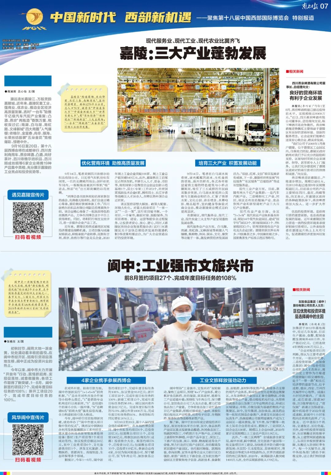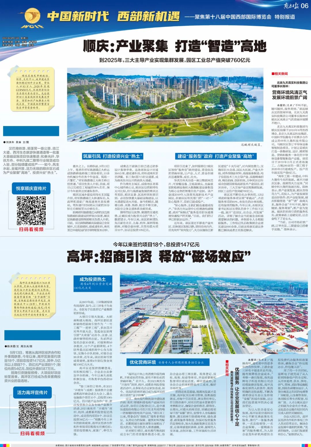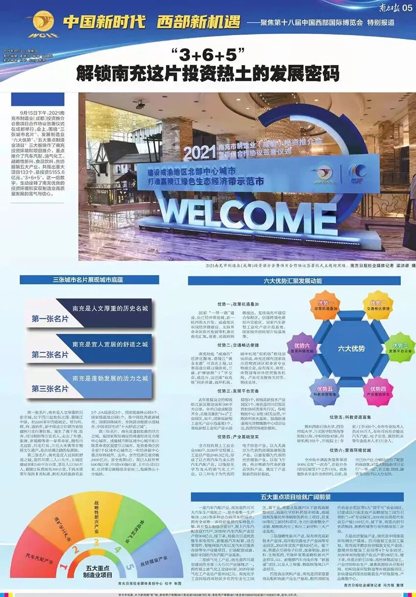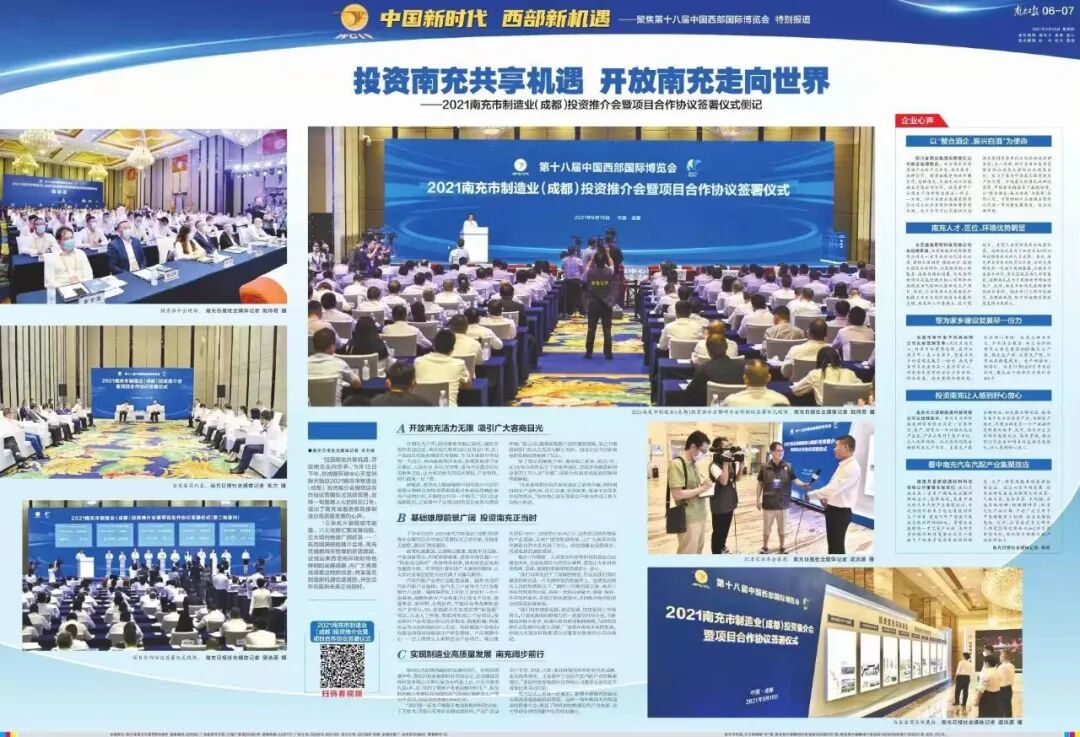 9月15日,《南充日报》用6个整版刊载西博会特别报道。其中,《备战西博会南充企业全力出征》详细介绍了南充备战西博会整体情况,并分别以《顺庆:产业聚集打造“智造”高地》《高坪:招商引资释放“磁场效应”》《嘉陵:三大产业蓬勃发展》等为题,为九县(市、区)和经开区“量身定制”半个版。当天的《南充日报》“长途跋涉”200多公里,被送往2021南充市制造业(成都)投资推介会暨项目合作协议签署仪式现场,得到与会嘉宾高度赞扬。