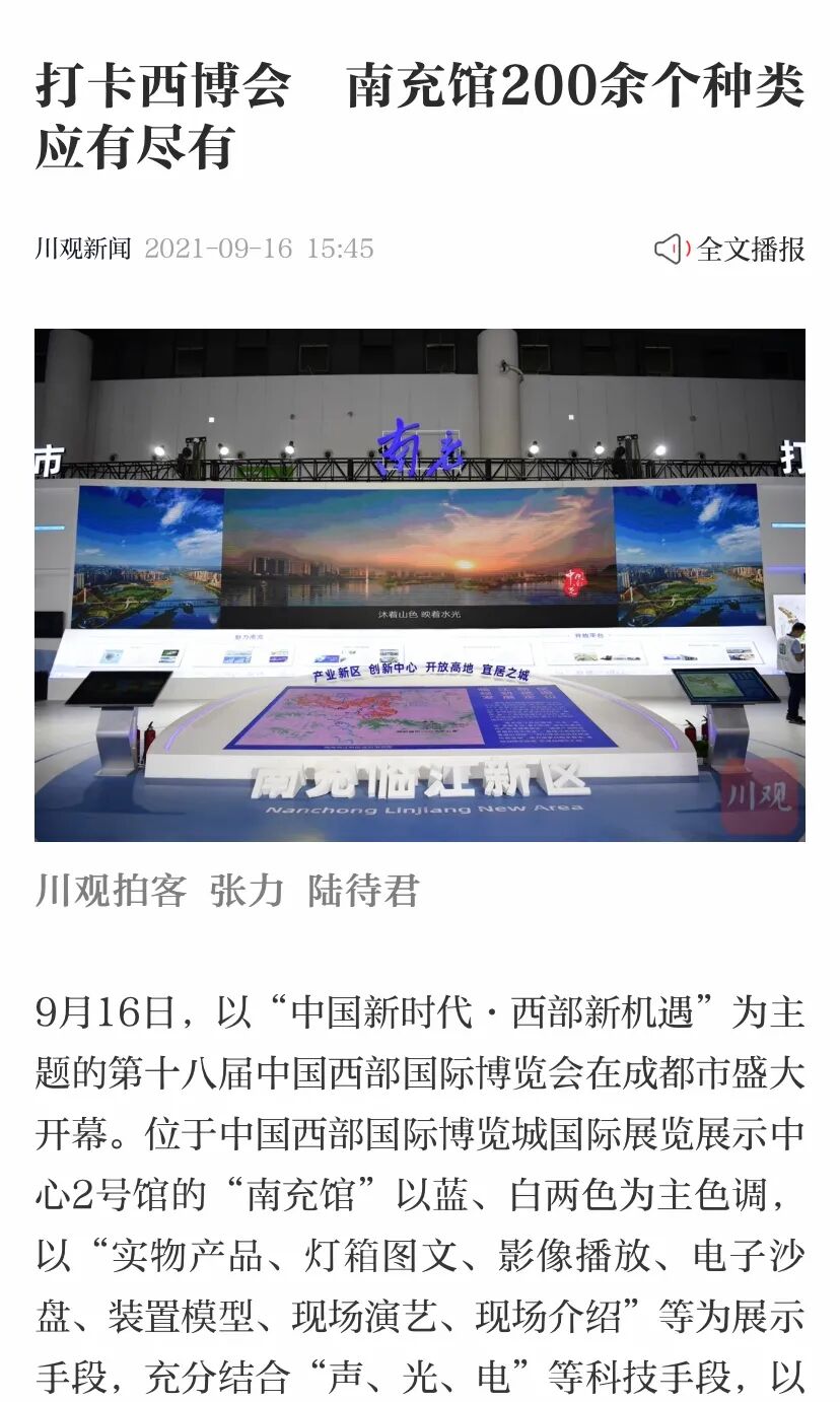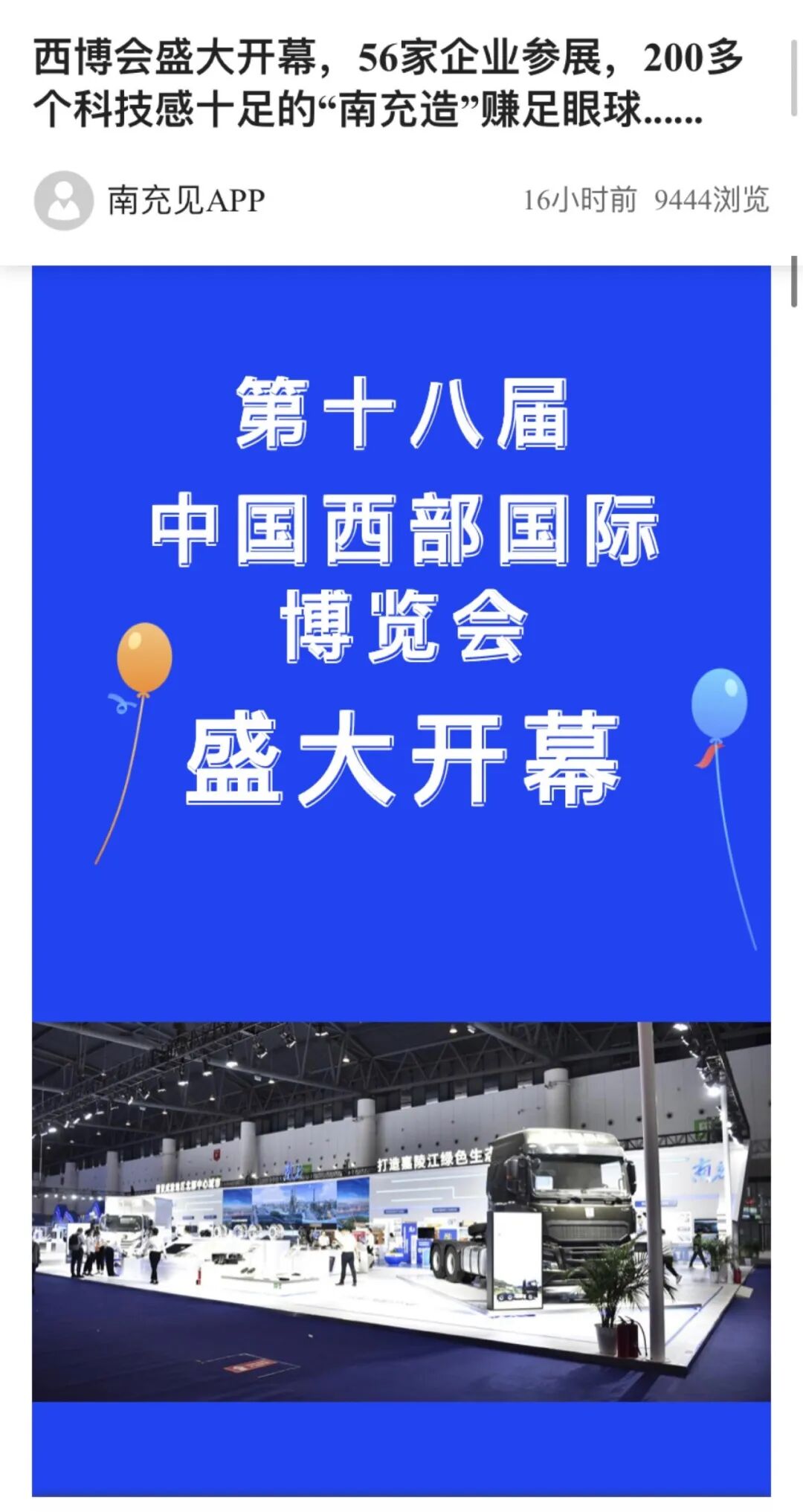 9月16日,第十八届中国西部国际博览会盛大开幕,《南充日报》、南充见APP围绕西博会打造出一系列新闻产品,引发热烈反响。其中,南充见APP制作的融媒报道《第十八届西博会上演重头戏,南充市制造业投资推介会盛大召开,签约106.6亿!》发布后,新华社、人民日报客户端相继转载。截至16日晚9时,新华社客户端阅读量超110万次。