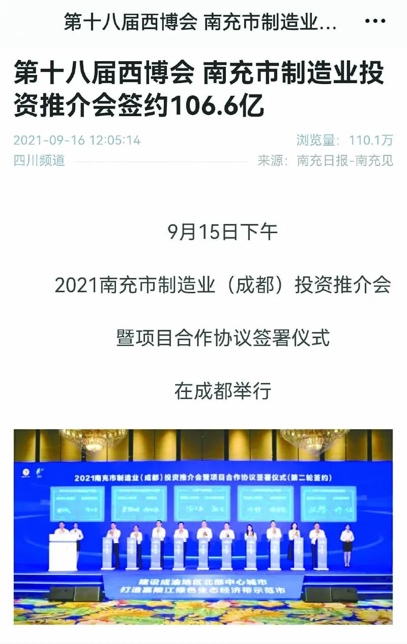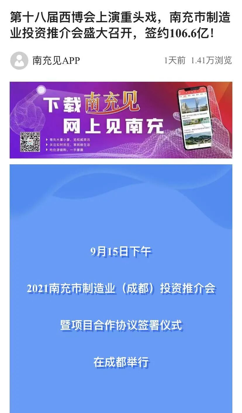 9月15日下午,本届西博会重头戏———2021南充市制造业(成都)投资推介会暨项目合作协议签署仪式在成都举行。南充见APP第一时间制作融媒报道《第十八届西博会上演重头戏,南充市制造业投资推介会盛大召开,签约106.6亿!》,运用大量文图和视频,不仅带读者感受到会场氛围,还生动阐释了南充“3+6+5”发展密码(三张城市名片、发展制造业“六大优势”、五大重点制造业项目)。