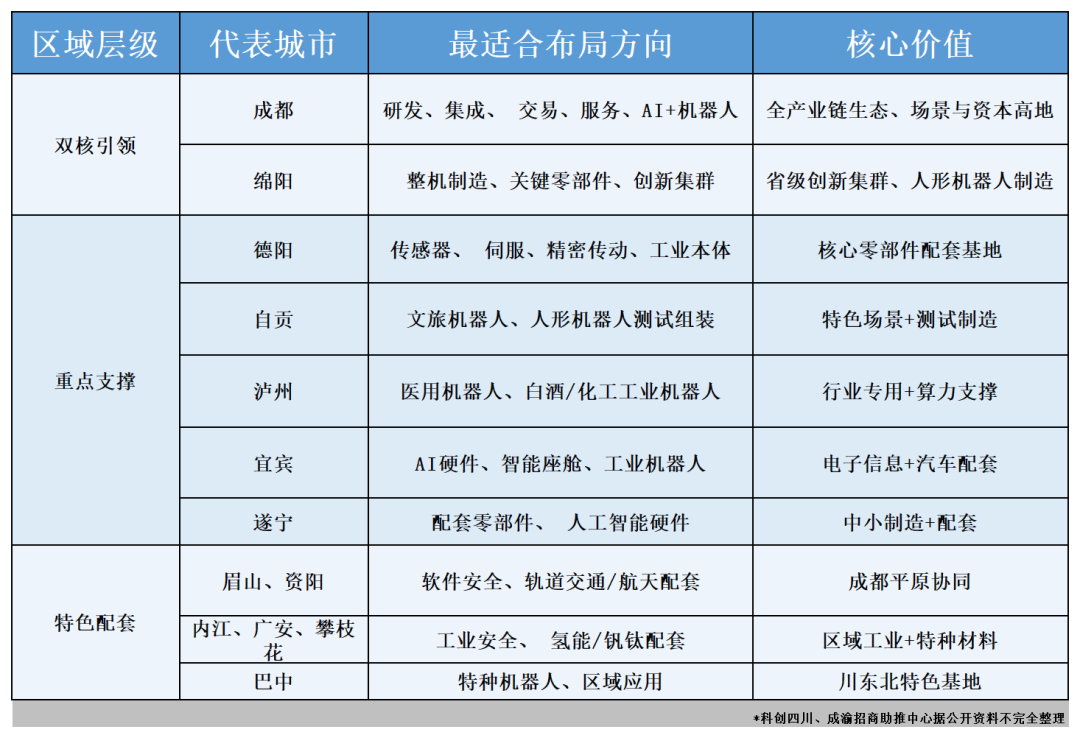 四川正加快构建成都、绵阳双核引领,德阳、眉山、资阳、内江、广安、攀枝花等多点支撑的人形机器人产业发展格局。并引导各地聚焦特色赛道与细分领域错位发展,加快形成全域联动的产业集群。