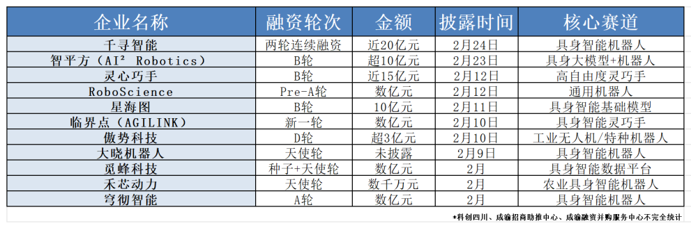 新质科创家产研团队不完全统计,2月国内机器人赛道发生的融资事件就有这些。数额更是全部突破千万,大部分破亿。