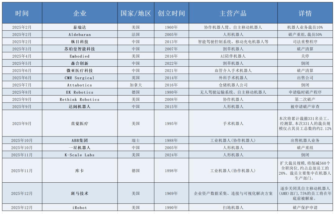 据不完全统计,2025年全球超20家机器人企业遭遇破产、裁员或业务剥离。法国人形机器人先驱Aldebaran进入司法清算,成立20年,说倒就倒;曾融资54亿、估值200亿的达闼机器人被申请破产审查;仓储机器人独角兽Attabotics资金枯竭倒闭;扫地机器人鼻祖iRobot申请破产保护;就连巨头库卡也裁员560人,ABB卖掉了机器人业务。