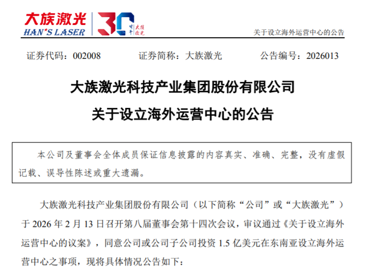投资1.5亿美元!大族激光拟在东南亚设立海外运营中心