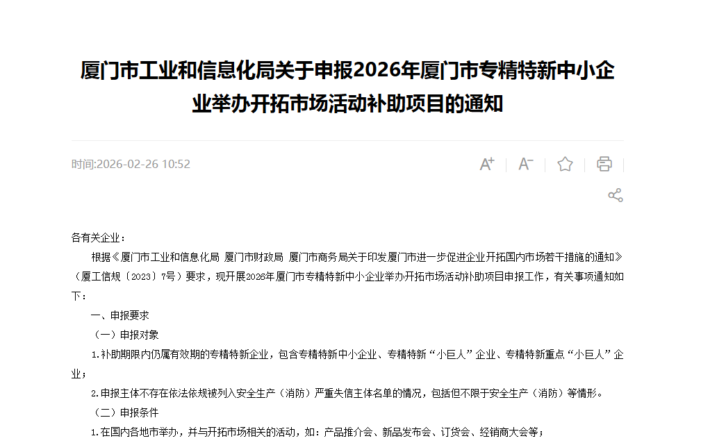 2月26日,厦门市工业和信息化局发布《厦门市工业和信息化局关于申报2026年厦门市专精特新中小企业举办开拓市场活动补助项目的通知》,开启2026年厦门市专精特新中小企业举办开拓市场活动补助项目申报工作。