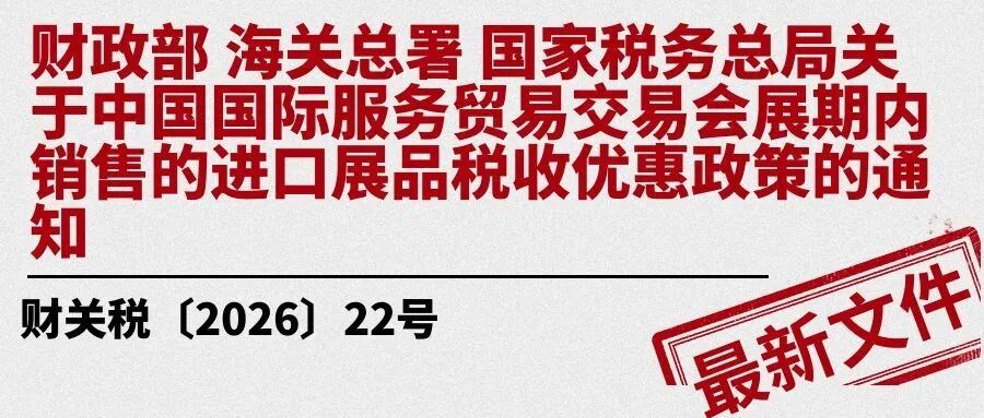 2026年2月28日 财政部 海关总署 国家税务总局关于中国国际服务贸易交易会展期内销售的进口展品税收优惠政策的通知 财关税〔2026〕22号 2026年2月28日 执行