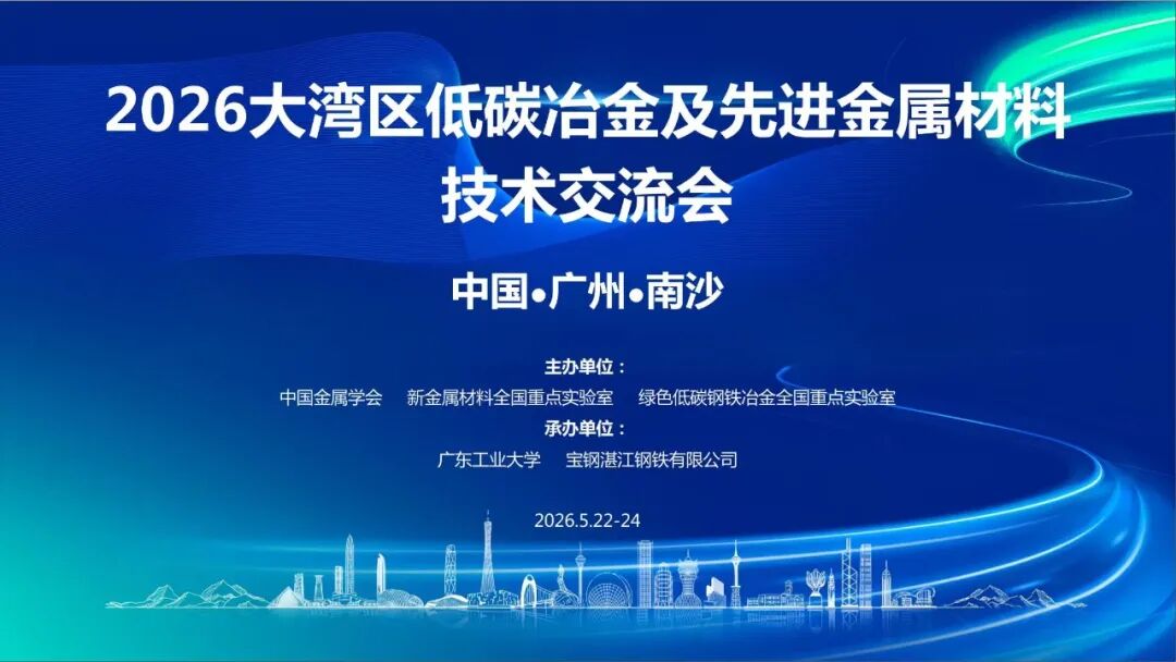 “2026大湾区低碳冶金及先进金属材料技术交流会”由中国金属学会、新金属材料全国重点实验室、绿色低碳钢铁冶金全国重点实验室联合主办,广东工业大学、宝钢湛江钢铁有限公司联合承办,冶金工业信息标准研究院等相关单位协办,拟定于2026年5月22-24日在广州召开。本次会议主要聚焦低碳冶金工程技术与基础研究、先进绿色钢铁材料及应用、冶金工业生产智能化等开展学术研讨与交流。会议将采取大会特邀报告、邀请报告、墙报交流等形式,邀请院士及相关行业领域内的专家在主会场作特邀报告。5月 24日上午设置三个分会场,分别是A. 低碳冶金、B. 冶金智能化、C. 先进绿色金属材料,邀请不同领域的专家作专业技术报告。