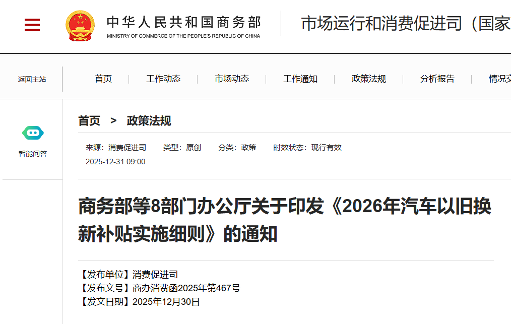 按照《国家发展改革委 财政部关于2026年实施大规模设备更新和消费品以旧换新政策的通知》(发改环资〔2025〕1745号,以下简称发改环资〔2025〕1745号文)和《商务部等7部门关于提质增效实施2026年消费品以旧换新政策的通知》(商消费函〔2025〕697号,以下简称商消费函〔2025〕697号文)要求,为更好实施2026年汽车以旧换新补贴政策,现将《2026年汽车以旧换新补贴实施细则》印发给你们,请认真执行。