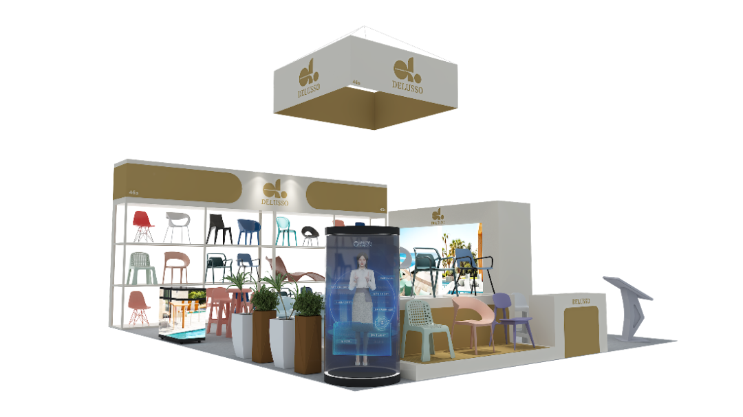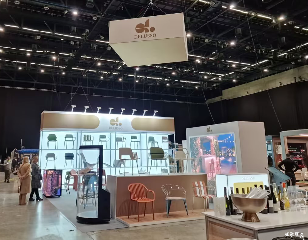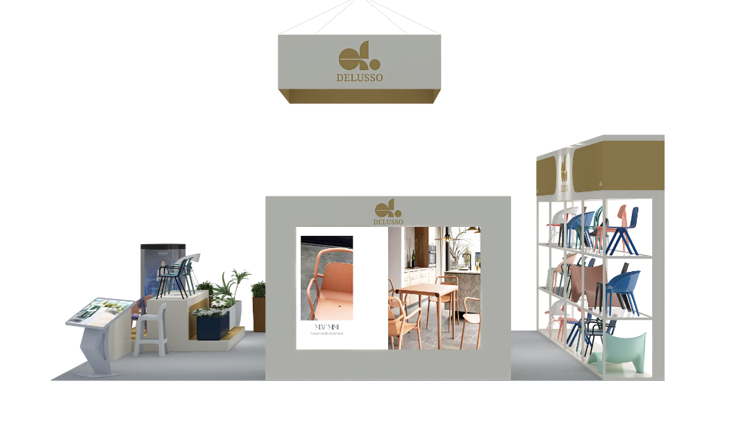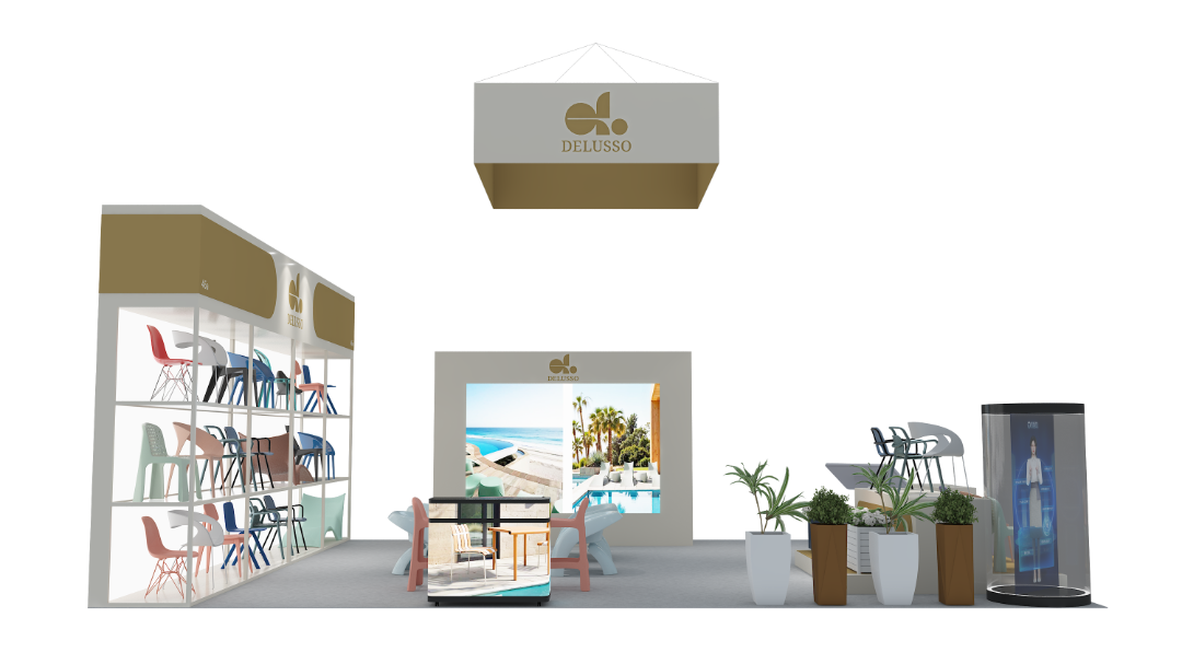在此次展会期间,如歌展览主要负责DELUSSO公司的展台设计及搭建一站式服务工作。本次展位设计以 “轻量可持续・场景化体验”为核心创意,深度契合布达佩斯花园博览会「户外生活、园艺美学」的展会主题,同时践行绿色环保的参展理念。以品牌标志性的米白 + 暖金为主色调,打造简约高级的视觉基调,既凸显 DELUSSO 品牌的轻奢质感,又与户外花园的自然氛围完美融合;以「开放式通透展陈 + 沉浸式场景」为创意载体,将多彩休闲椅产品以「分层陈列 + 场景还原」的方式呈现,让观众直观感受产品在真实户外 / 家居场景中的应用效果;融入数字互动与自然绿植元素,打造「产品展示 + 商务洽谈 + 品牌体验」三位一体的空间,既满足 B2B 商贸需求,又契合园艺展的休闲属性,强化品牌在中东欧市场的专业形象。