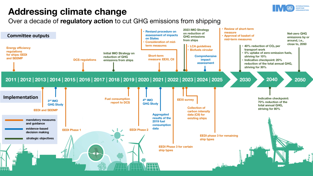 图 IMO温室气体减排十年行动时间线(2011-2050年)(数据来源:IMO官网,2025;展示EEDI、SEEMP及净零目标等关键节点)