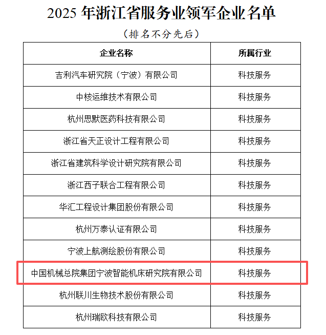 近日,浙江省发展和改革委员会对2025年省服务业领军企业名单进行公示,宁波机床院凭借在工业母机领域的扎实积累与核心知识产权优势,通过严格审核,成功入选“科技服务类领军企业”。