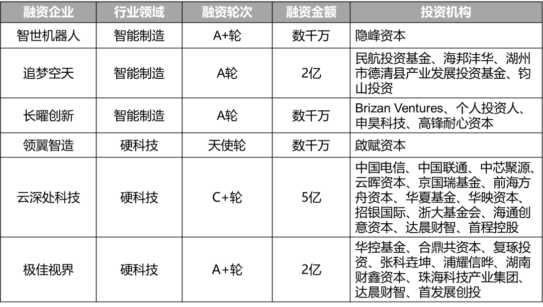 项目简介:智世机器人是一家仓储机器人研发商,主要从事四向穿梭车研发制造业务,可在货物密集的立体仓库中,利用托盘实现货物存取、理货,从而实现自动化立体存储。投资方:民航投资基金、海邦沣华、湖州市德清县产业发展投资基金、钧山投资项目简介:追梦空天是一家智能电动倾转旋翼飞机研制商,专注于航空科技领域,主要从事智能电动倾转旋翼飞机研制、销售与服务保障业务。投资方:Brizan Ventures、个人投资人、申昊科技、高锋耐心资本项目简介:长曜创新是一家智能割草机器人研发商,面向全球消费者提供家用无边界智能割草机器人,该机器人可借助UWB、RTK(Real-time kinematic)、激光SLAM和视觉SLAM等多种定位解决方案实现草坪、缓坡等多场景自主作业,用户只需通过手机APP遥控操作,可启动、监控与停止割草任务。项目简介:领翼智造是一家eVTOL复合材料研发商,主要从事eVTOL碳纤维复合材料关键部件的研发与制造等相关业务。投资方:中国电信、中国联通、中芯聚源、云晖资本、京国瑞基金、前海方舟资本、华夏基金、华映资本、招银国际、浙大基金会、海通创意资本、达晨财智、首程控股项目简介:云深处科技是一家四足机器人及其核心零部件研发商,公司聚焦具身智能技术创新与行业应用,专注于四足机器人、人形机器人及核心零部件的研发、生产、销售和服务,构建了“感知-决策-执行”全链路技术体系,其核心的多模态环境感知、跨场景具身导航、AI驱动的感控融合运动控制等新技术,已在多个新场景中应用落地。投资方:华控基金、合鼎共资本、复琢投资、张科垚坤、浦耀信晔、湖南财鑫资本、珠海科技产业集团、达晨财智、首发展创投项目简介:极佳视界是一家Physical AI解决方案提供商,主要从事世界模型和具身智能方向技术产品研发业务,主要产品有具身基础模型GigaBrain-0正式版。在此,厚福资本再次恭喜以上获得融资的企业,未来业绩长虹,行稳致远,不断通过科技创新助力中国实体经济的高质量发展。