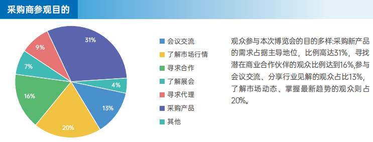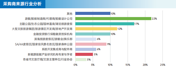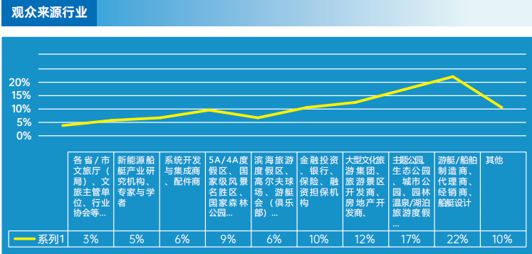 本届展会的采购商构成呈现多元化特点,其中来自游艇/船艇制造商、代理商、经销商和主题公园、生态公园的参观者分别为22%和17%,在投资领域,旅游开发商、文旅集团、房地产开发商等关键参与者的比例达12%同时,来自旅游景区景点的代表-一主题乐园、生态公园、城市公园、滨海旅游度假区、国家风景名胜区、游艇会的观众比例合计32%。